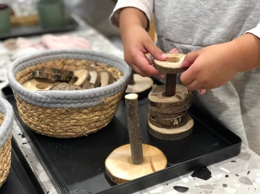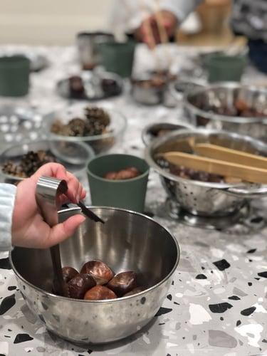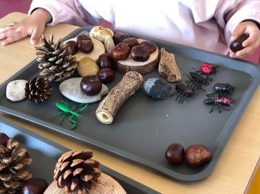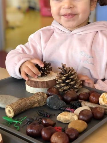 De grands bacs pour experimenter à plusieurs tout un tas d'éléments naturel mis en scène pour renforcer l'envie d'explorer et les interactions.
